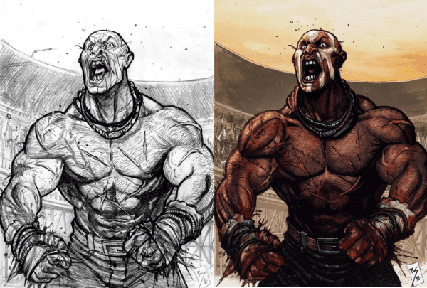 After we have approved the sketch and the final ink, the piece is colored (sometimes by a different artist who specializes in coloring):