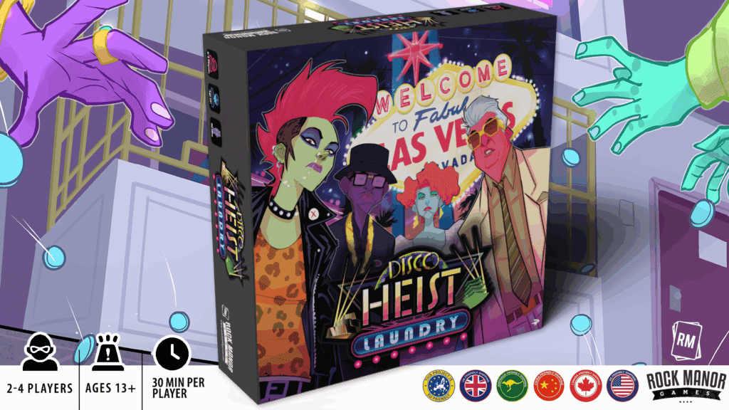Disco Heist Laundry is a competitive game for 2-4 players about planning and executing the perfect heist in 1980s Las Vegas designed by Mike Gnade (Maximum Apocalypse, Lawyer Up) and Todd Walsh (Set a Watch series). Put together a Crew of crooks, dodge the fuzz, shakedown the city, and launder the most money so you can skip town and retire to a tropical island. If you want to learn more, here is a great overview of how to play the game: