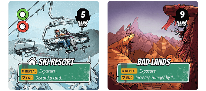 Exposure: Survivors will be facing extreme conditions and will need to stay inside to avoid exposure to the elements. Survivors that are exposed (located on outdoor tiles) will draw negative status effects from the Exposure deck. It might start off as frostnip, but can grow into pneumonia or worse. The Exposure deck allows us to introduce apocalyptic dangers outside of the traditional monster deck.