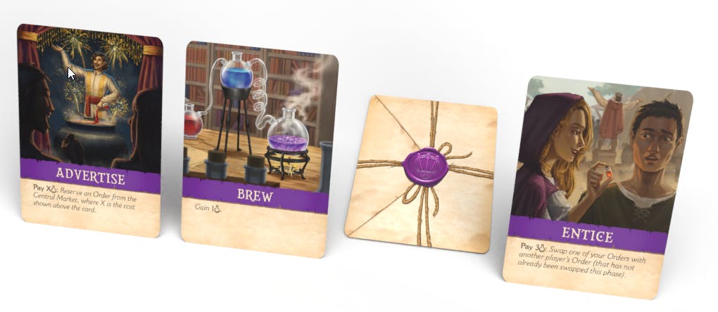 Dangerous Business also adds a new phase to the game where players pick an action: Brewing more potions, advertising to a central pool of customers, stealing them from your opponents, or grabbing potion recipes that provide new powerful abilities.