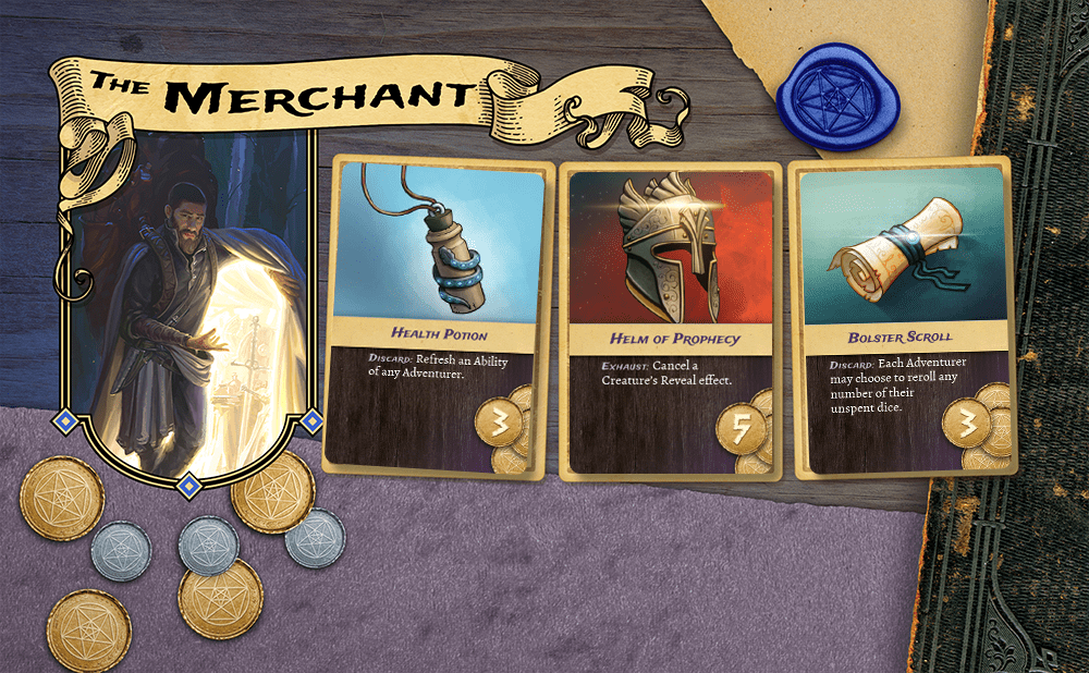 After the camp phase, Adventurers may spend their coin to acquire new items from the merchant board. Each Adventurer can hold up to two items. Some items are discarded for one time effects while others are powerful weapons and equipment that supplement your ability cards.